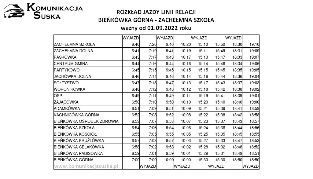 Nowa linia przewiduje realizację 4 par kursów dziennie i ruszy wraz z nowym rokiem szkolnym, tj. od 1 września 2022 roku. Co ważne, w przeciwieństwie do wielu innych linii z dofinansowania tworzonych na terenie powiatu suskiego, kursy będą wykonywane codziennie, tj. od poniedziałku do niedzieli. Z przystanku Zachełmna Szkoła bus odjedzie o godz. 6:40, 9:40, 15:10, 18:30, a z Bieńkówki Górnej o godz. 7:00, 10:00, 15:30 oraz 18:50. Przejazd na całej długości trasy potrwa 20 minut. Po drodze bus zatrzyma się na 17 przystankach. Linia będzie obsługiwana przez firmę Leona Bukowskiego z Budzowa. Cennik biletów nie jest jeszcze znany.
