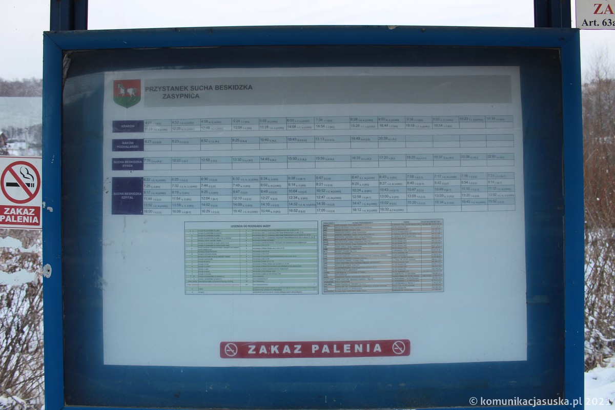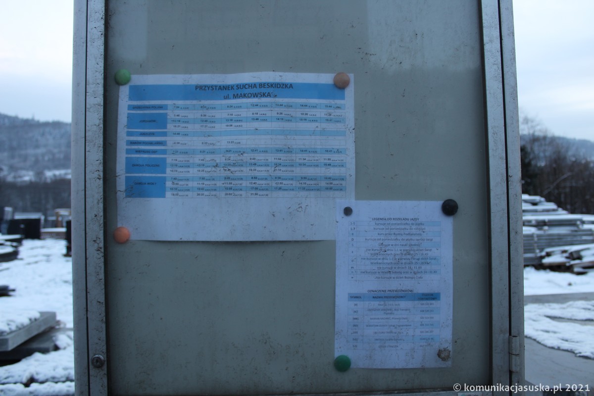 Nowe rozkłady jazdy pojawiły się na prawie wszystkich przystankach wzdłuż głównej ulicy miasta, tj. ul. Makowska (w kierunku Makowa Podhalańskiego), ul. Piłsudskiego (w obydwu kierunkach), Rynek (w obydwu kierunkach), ul. Mickiewicza (tylko w kierunku Rynku) oraz PKP (w obydwu kierunkach). Stare rozkłady pozostały na czterech przystankach: ul. Makowska (w kierunku centrum miasta), Mickiewicza PKS (kierunek Stryszawa) oraz Zasypnica (w obydwu kierunkach). Nieaktualny rozkład jazdy znajduje się również w gablocie dworca autobusowego, z którego obecnie nie są realizowane żadne odjazdy.