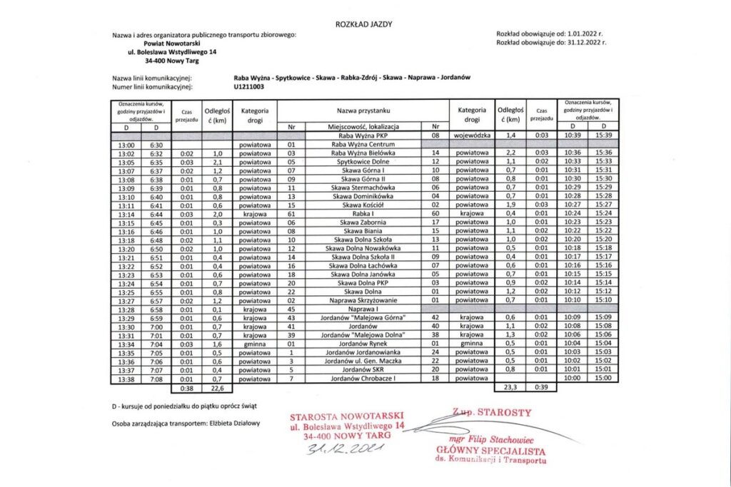 Rozkład jazdy oraz cennik pozostają bez zmian. Kursy realizowane są od poniedziałku do piątku oprócz świąt. Dziennie wykonywane są dwie pary kursów. Bus z Raby Wyżnej odjeżdża o 6:3013:00, a z Jordanowa10:0015:00. Podróż na całej długości linii zajmuje niecałe 40 minut i kosztuje 7,50 zł. Bus dojeżdża do przystanku Jordanów Chrobacze I leżącym w pobliżu Zespołu Szkół im. bł. ks. Piotra Dańkowskiego, co ułatwia dojazd uczniom do szkoły.