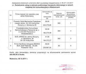 Do walki o obsługę wadowickiej komunikacji stanęły cztery firmy, w tym jedna z powiatu suskiego. Były to: Przedsiębiorstwo Komunikacji Samochodowej w Pszczynie, Firma Handlowo-Usługowa BESKID BUS Józef Wątroba z Krzeszowa, BUS JANISO sp. jawna z Roczyn oraz Przewóz Osób Mechanika Pojazdowa Leszek Janiso z Andrychowa.