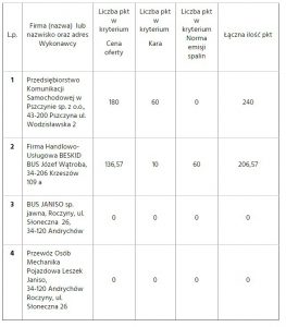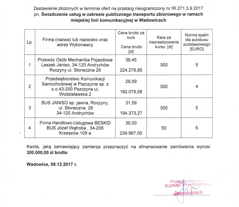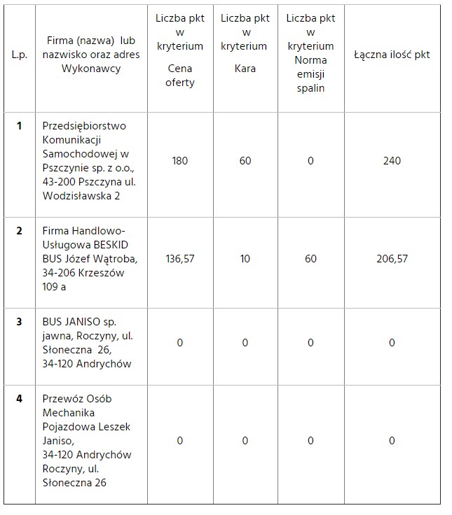 Firma z powiatu suskiego w swojej ofercie zaproponowała pojazd z najwyższą normą spalin (Euro 6) w porównaniu do swoich konkurentów. Niestety pozostałe kryteria wypadły dużo gorzej. Cena za jeden zrealizowany kurs okazała się najwyższa, z kolei kara za niezrealizowany najniższa. Spowodowało to, że firma zajęła drugie miejsce (zabrakło 33,44 pkt. do zwycięstwa w przetargu) i przegrała z PKS w Pszczynie, które zostało nowym operatorem wadowickiej komunikacji miejskiej.