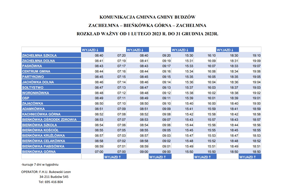 Obecny rozkład jazdy obejmuje 4 pary kursów realizowanych codziennie, od poniedziałku do niedzieli. Odjazdy z Zachełmnej mają miejsce o godzinach 6:40, 8:40, 15:30, 18:30, natomiast powrotne z Bieńkówki o godz. 7:00, 9:00, 15:50, 18:50. Poniżej prezentujemy aktualny rozkład jazdy.