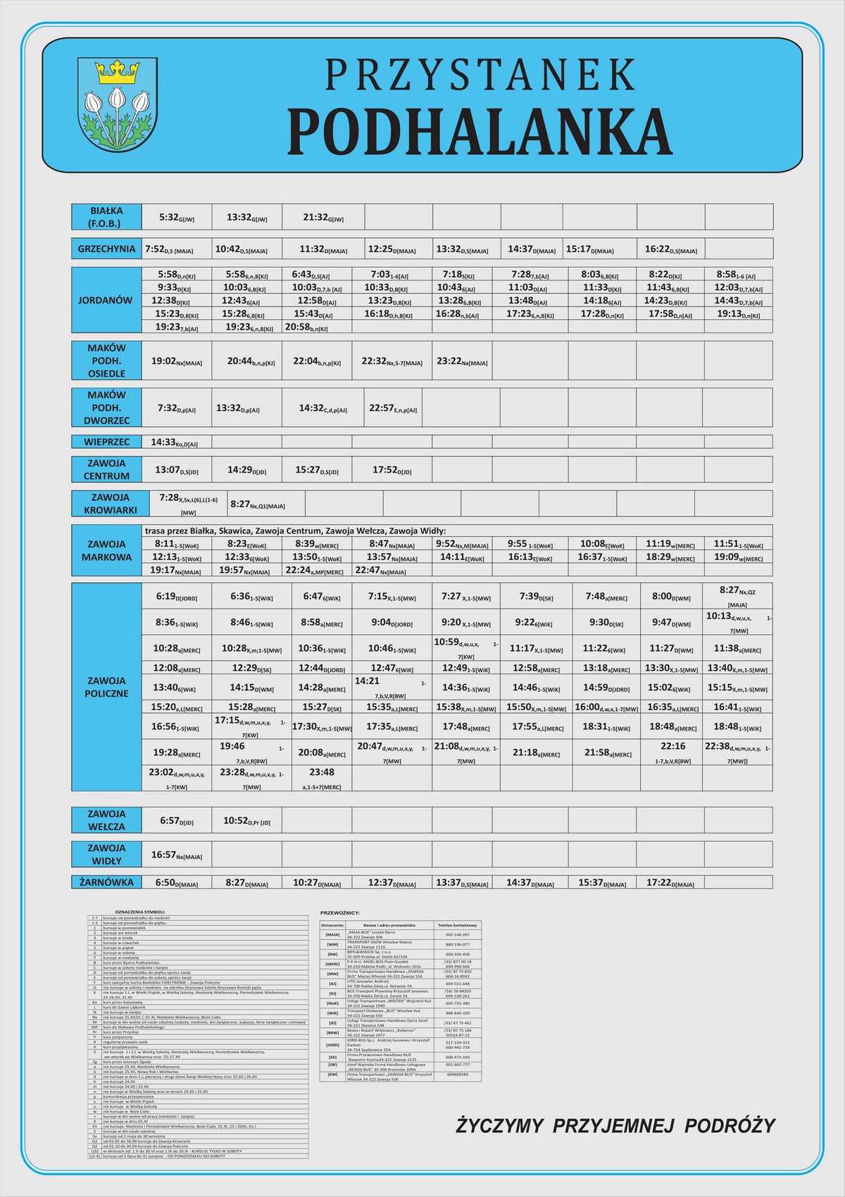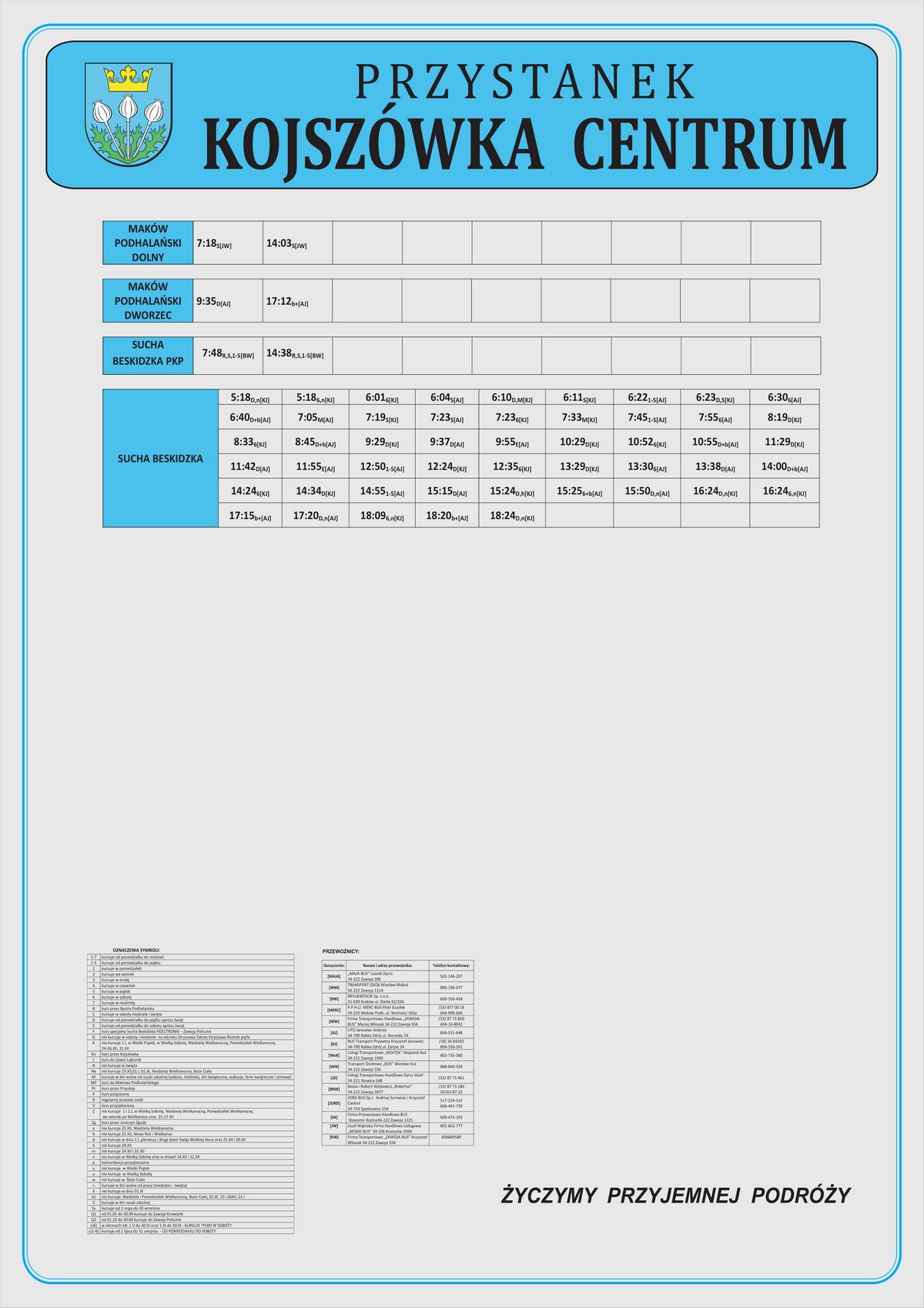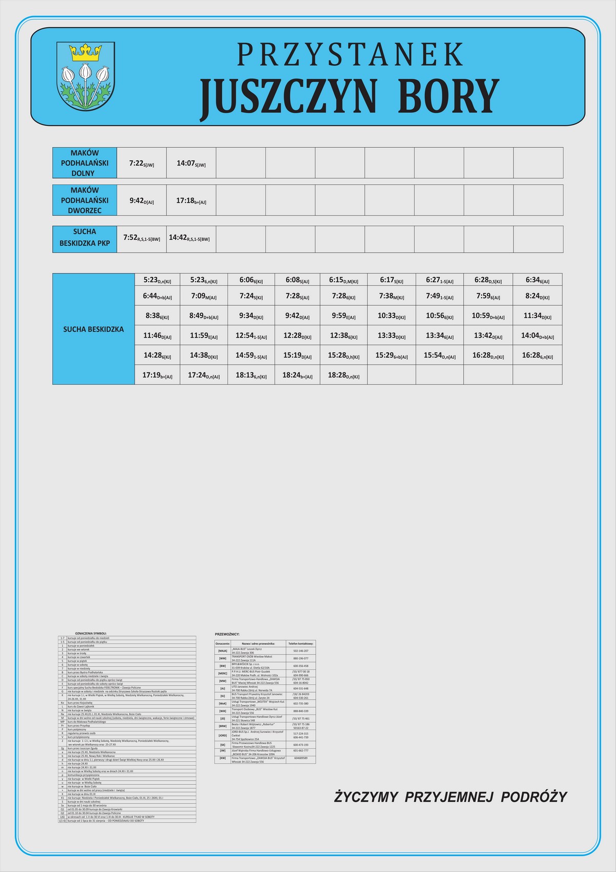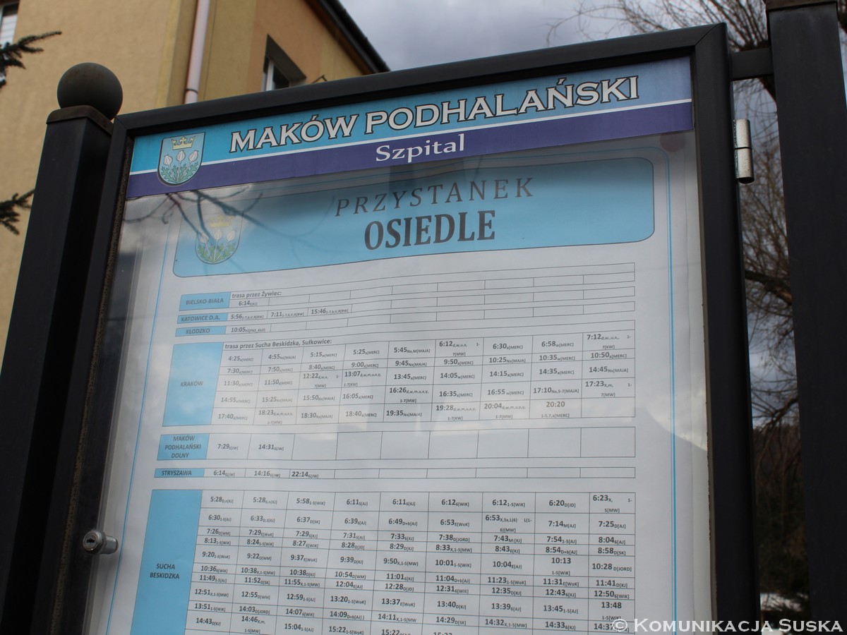 Nowe plansze z rozkładami pojawiły się łącznie na 21 przystankach: dziesięciu w Makowie Podhalańskim, sześciu w Białce, trzech w Juszczynie oraz dwóch w Kojszówce. Grafiki z rozkładami, tak jak poprzednio, zostały opublikowane na naszej stronie w zakładce „rozkłady jazdy > tabliczki przystankowe„.