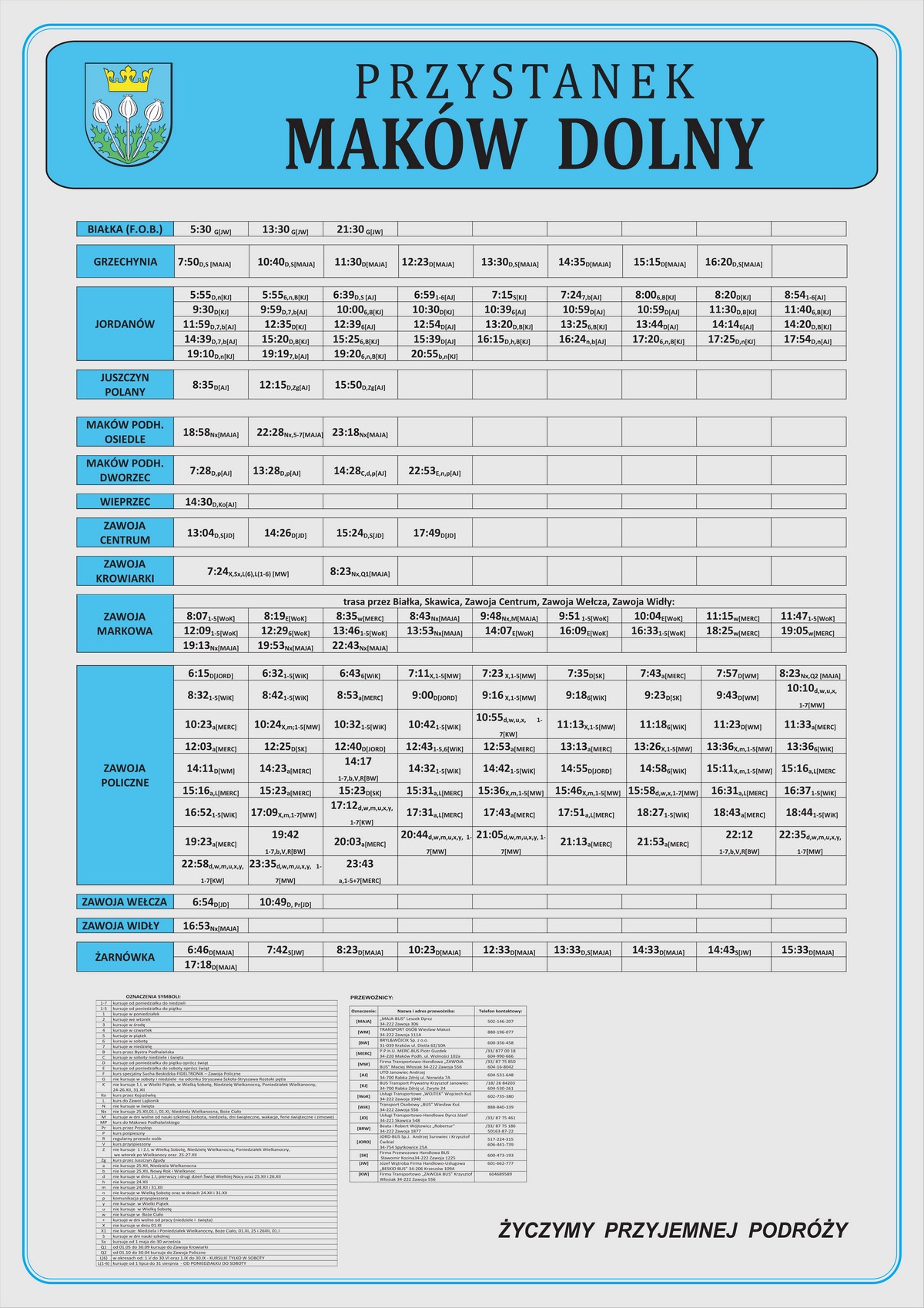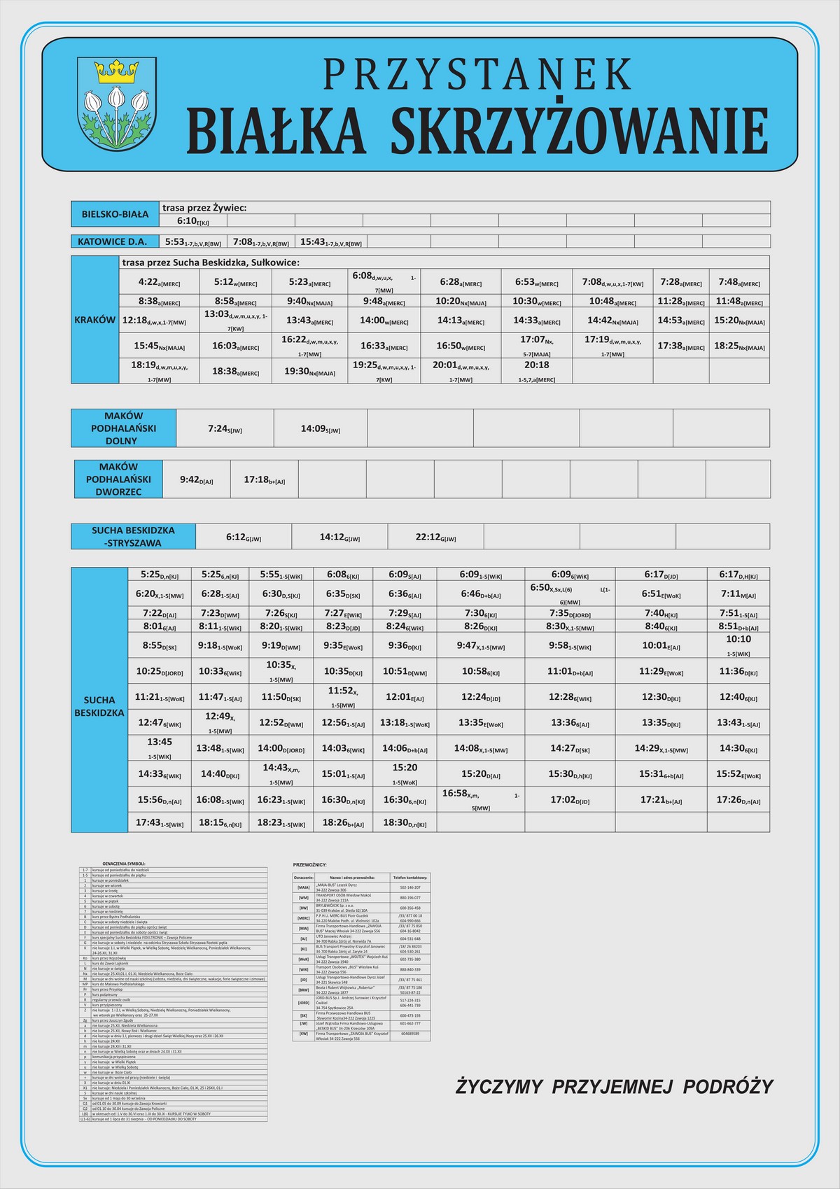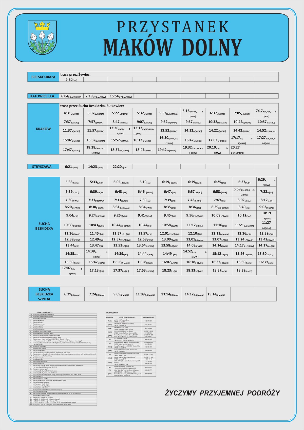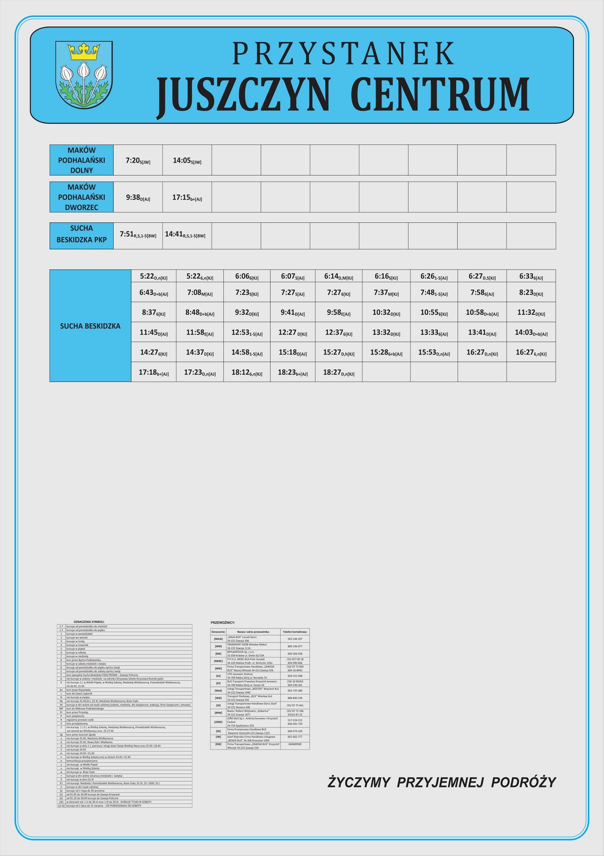 Nowe plansze z rozkładami pojawiły się łącznie na 21 przystankach: dziesięciu w Makowie Podhalańskim, sześciu w Białce, trzech w Juszczynie oraz dwóch w Kojszówce. Grafiki z rozkładami, tak jak poprzednio, zostały opublikowane na naszej stronie w zakładce „rozkłady jazdy > tabliczki przystankowe„.