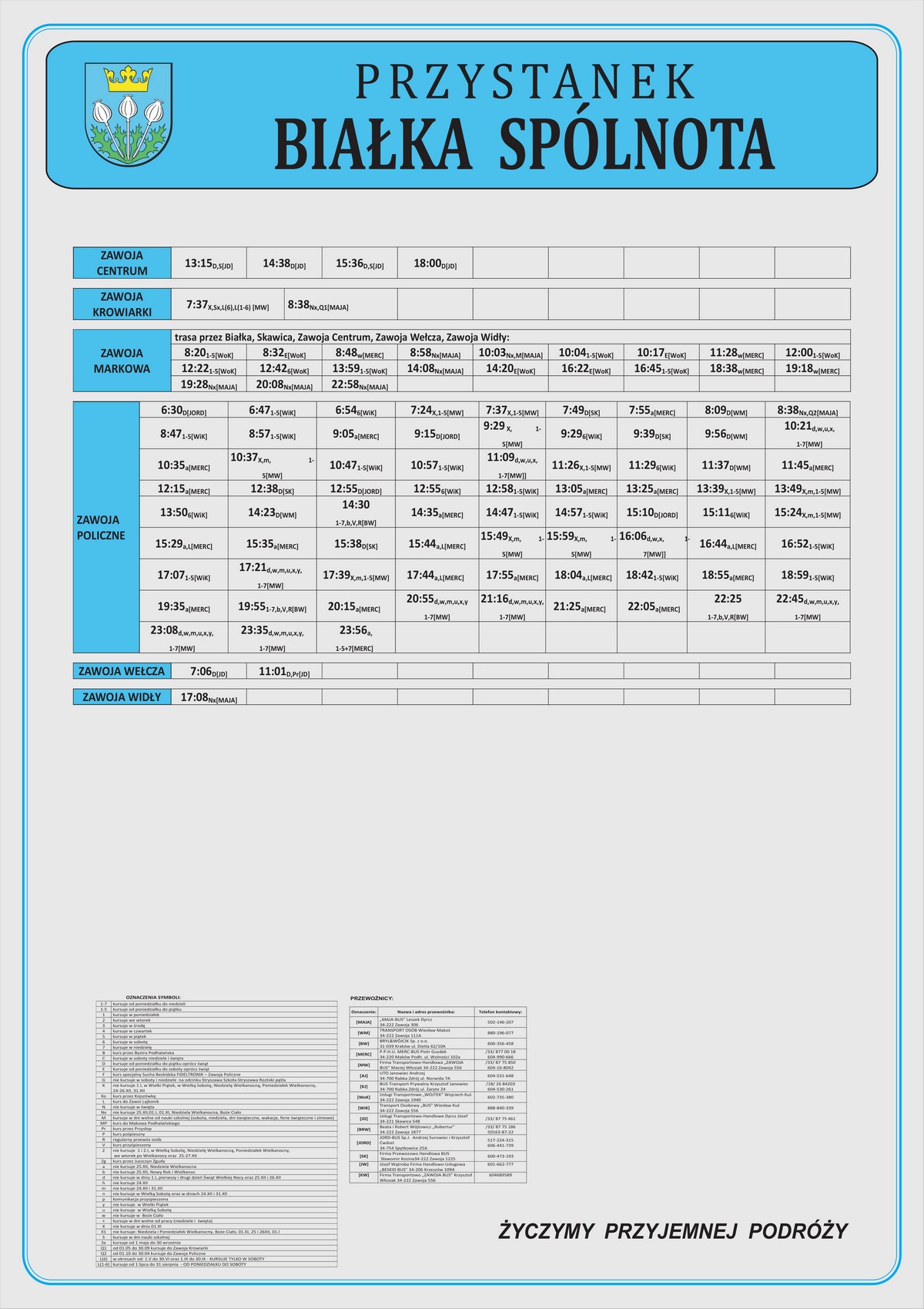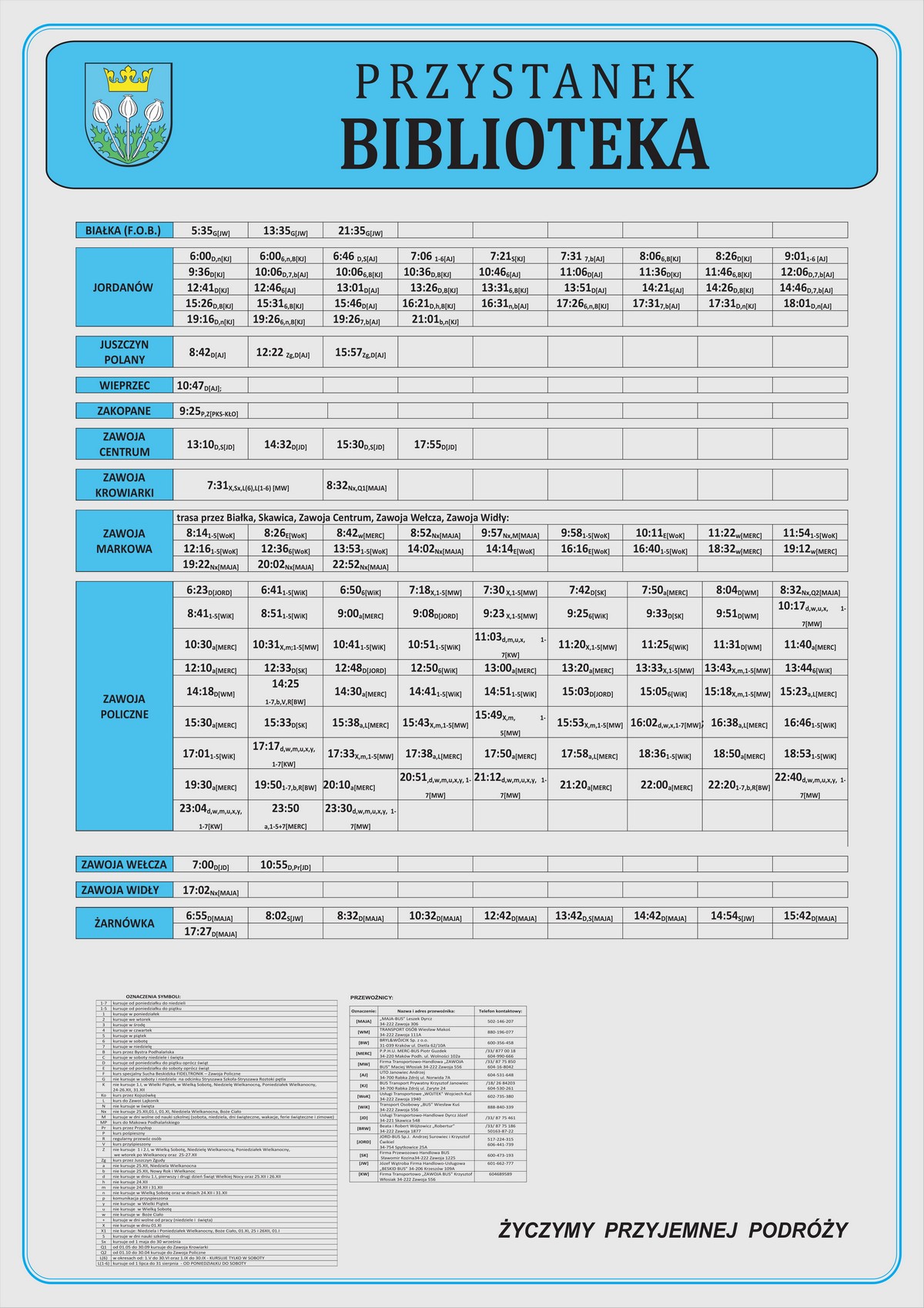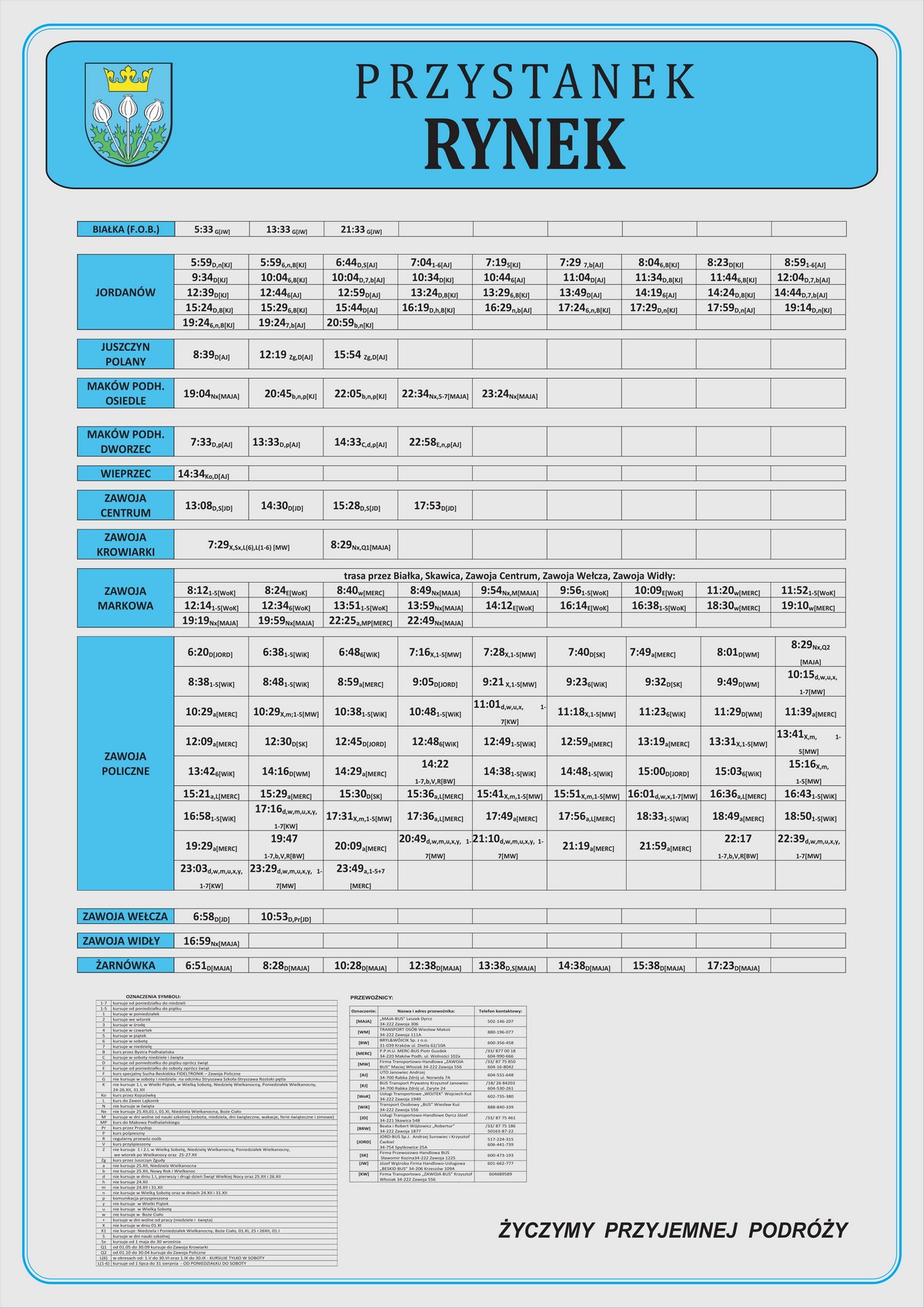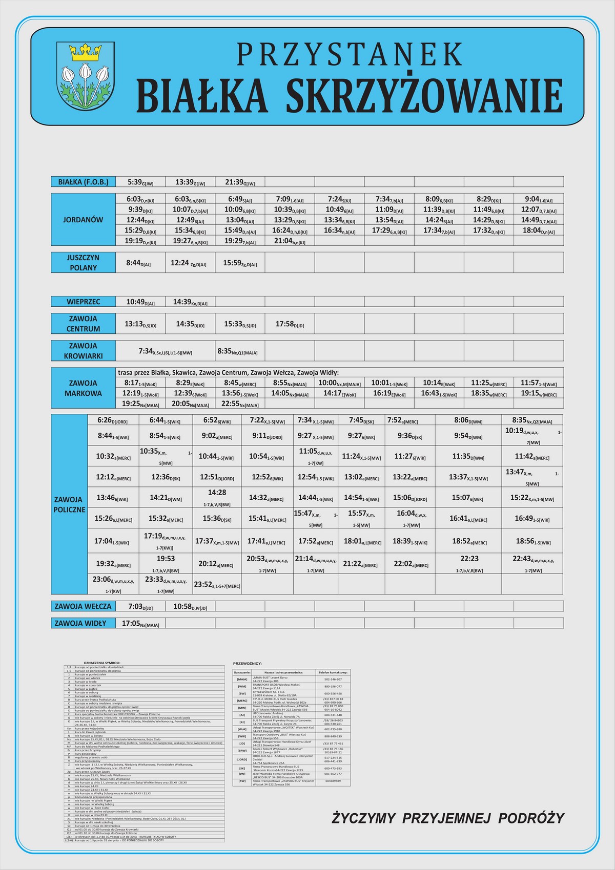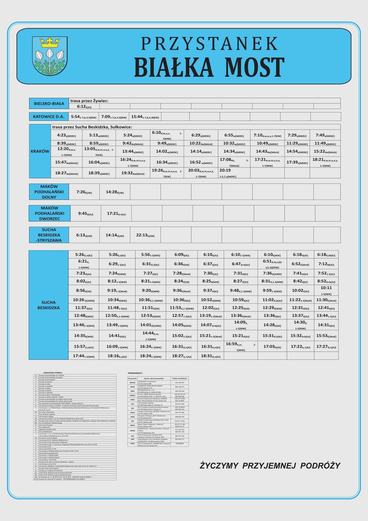Nowe plansze z rozkładami pojawiły się łącznie na 21 przystankach: dziesięciu w Makowie Podhalańskim, sześciu w Białce, trzech w Juszczynie oraz dwóch w Kojszówce. Grafiki z rozkładami, tak jak poprzednio, zostały opublikowane na naszej stronie w zakładce „rozkłady jazdy > tabliczki przystankowe„.