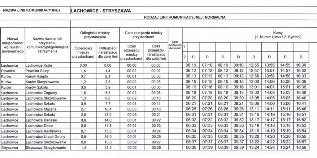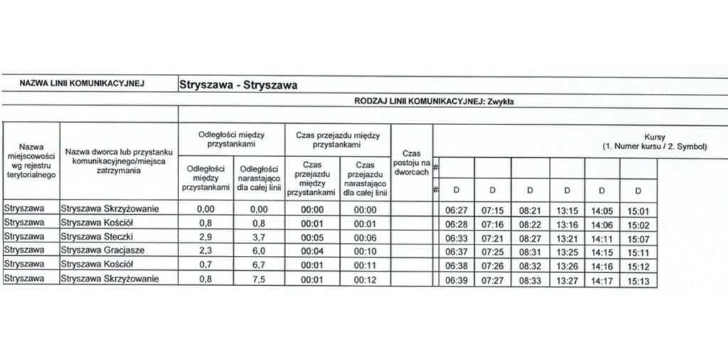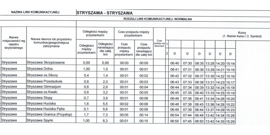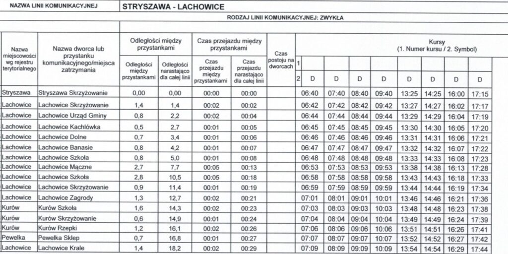 Wszystkie kursy będą realizowane w dni robocze, od poniedziałku do piątku. Dziennie zostanie wykonanych łącznie 50 kursów na wszystkich liniach. Poniżej prezentujemy szczegółowe rozkłady jazdy dostępne na stronie internetowej Urzędu Gminy w Stryszawie.