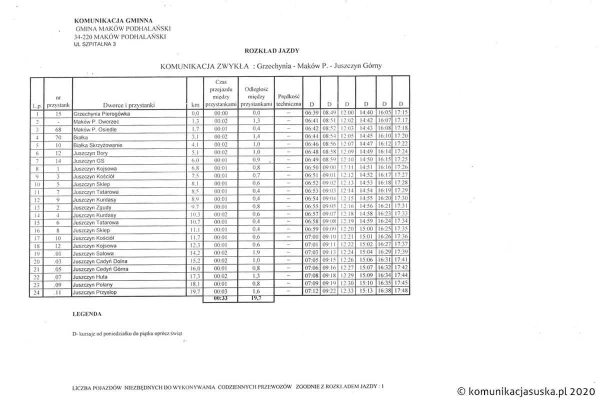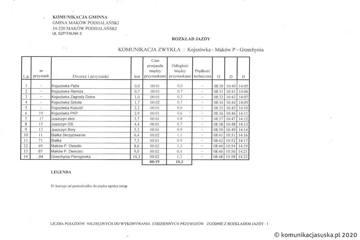 Zgodnie z rozkładami będą realizowane 42 kursy dziennie. Po 6 kursów z Grzechyni do Żarnówki, Wieprzca i Juszczyna oraz 3 kursy dziennie z Grzechyni do Kojszówki. Szczegółowe rozkłady jazdy wraz z listą obsługiwanych przystanków umieszczamy na końcu artykułu.