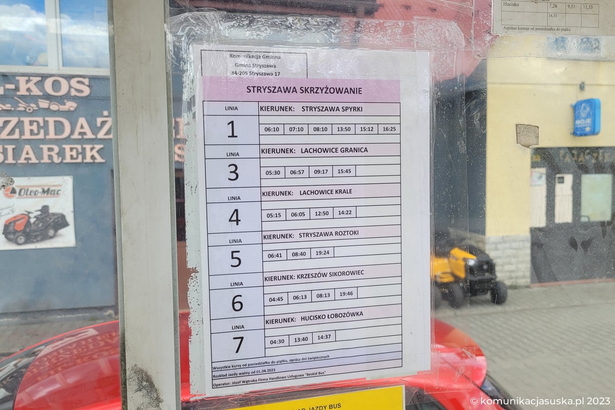 Z dniem 1 kwietnia 2023 roku korekcie uległy rozkłady jazdy na liniach użyteczności publicznej w Gminie Stryszawie nazywane „komunikacją gminną”. Linie zostały uruchomione dzięki pozyskanych środkom z Funduszu Rozwoju Połączeń Autobusowych. Kursy są realizowane przez operatora, którym jest Firma Handlowo Usługowa Beskid BUS Józefa Wątroby z Krzeszowa.