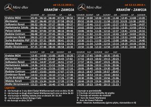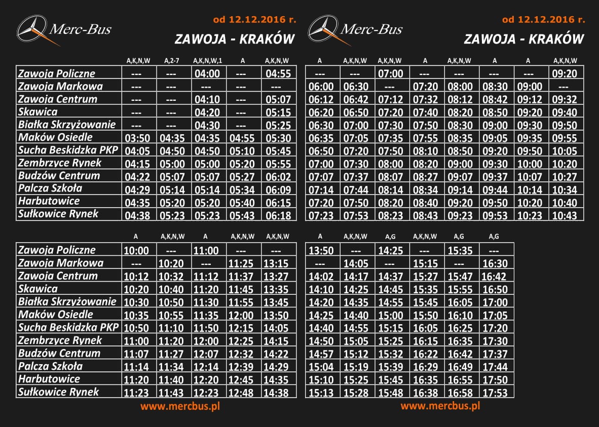Firma Merc-Bus obsługująca linię Zawoja – Kraków wprowadziła ograniczenia w realizacji swoich kursów. Zmiany dotyczą dwóch ostatnich par kursów realizowanych w ciągu dnia. Do odwołania zawieszone zostały kursy z Zawoi Markowej z godz. 17:20 oraz powrotny z Krakowa z godz. 20:20. Zlikwidowana została natomiast następująca para kursów: z Zawoi Markowej z godz. 17:50 oraz z Krakowa z godz. 22:20.