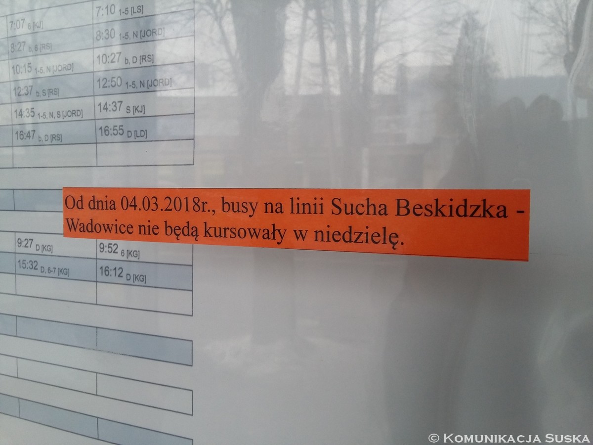 Na gablotach przystankowych w Suchej Beskidzkiej zostały umieszczone naklejki informujące pasażerów o ważnych zmianach na linii Sucha Beskidzka – Wadowice realizowanych przez firmę Trans G. K. z Mucharza. Od ubiegłej niedzieli, tj. 4 marca 2018 roku, firma zaprzestała realizacji kursów we wszystkie niedziele. Łącznie firma zlikwidowała 5 par kursów obsługiwanych w ostatni dzień tygodnia.