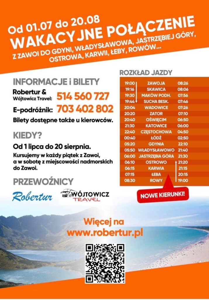Już po raz szósty firma Robertur z Zawoi wraz z firmą Wójtowicz Travel wyruszą nad polskie morze w wakacyjnej linii regularnej. Linia obsługiwana jest corocznie od 2017 roku. Dzięki połączeniu mieszkańcy powiatu suskiego zyskują bezpośrednie połączenie autobusowego z polskim morzem oraz kilkoma dużymi miastami w Polsce.