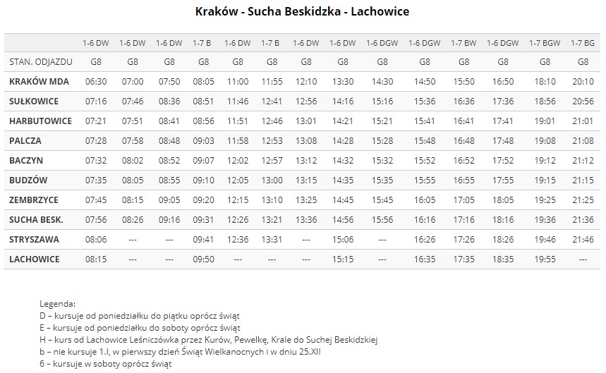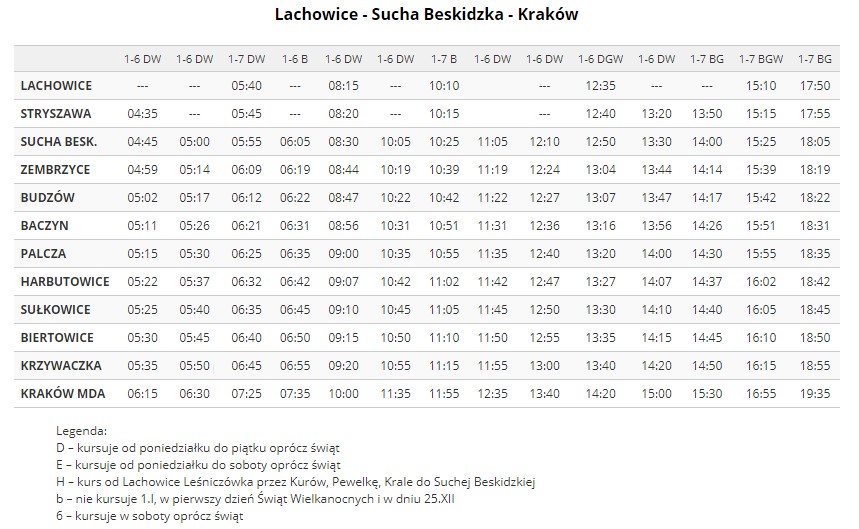 Firma RS Transport w większości realizuje rozkład jazdy firmy Jord-Bus. Wprowadzone zostały jedynie zmiany w postaci likwidacji dwóch kursów z Suchej Beskidzkiej do Krakowa (o godz. 8:05 oraz 15:10). Ostatecznie w Lachowicach rozpoczyna się 6 kursów, 3 w Stryszawie oraz 5 w Suchej Beskidzkiej. Wszystkie kursy kończą trasę na Małopolskim Dworcu Autobusowym w Krakowie, skąd też rozpoczynają swój bieg w kierunku powrotnym. Odjazdy mają miejsce ze stanowiska G8, a kończą swój bieg siedmiokrotnie w Lachowicach, trzykrotnie w Stryszawie oraz czterokrotnie w Suchej Beskidzkiej.