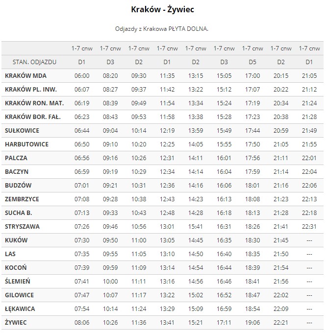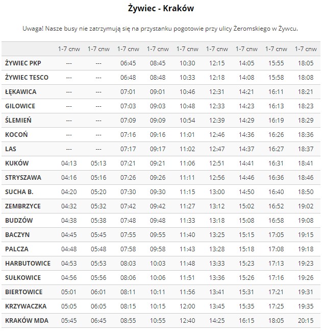 Z dniem 18 września 2017 roku nastąpiła drobna zmiana w rozkładzie jazdy firmy RS Transport na linii Żywiec – Kraków – Żywiec przez Łękawicę, Gilowice, Ślemień, Kocoń, Las, Kuków, Stryszawę, Suchą Beskidzką, Zembrzyce, Budzów, Palczę, Harbutowice, Sułkowice, Biertowice, Izdebnik, Krzywaczkę, Głogoczów, Mogilany, Gaj i Libertów. Wieczorny kurs z Krakowa z godz. 21:05 dojedzie tylko do przystanku Kuków Rzyczki, a nie tak jak wcześniej do Żywca.