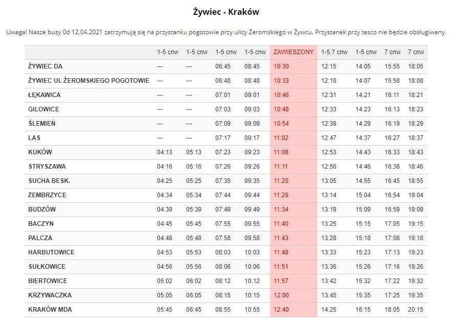 Firma RS Transport informuje na swojej stronie internetowej, że od 12 kwietnia 2021 r. nastąpiła zmiana przystanków obsługiwanych w Żywcu na linii relacji Żywiec – Kraków. Dotychczas busy zatrzymywały się na dworcu autobusowym oraz na przystanku przy hipermarkecie Tesco. Teraz busy będą zatrzymywać się na przystanku przy ul. Żeromskiego, natomiast nie będą wjeżdżać już pod Tesco.