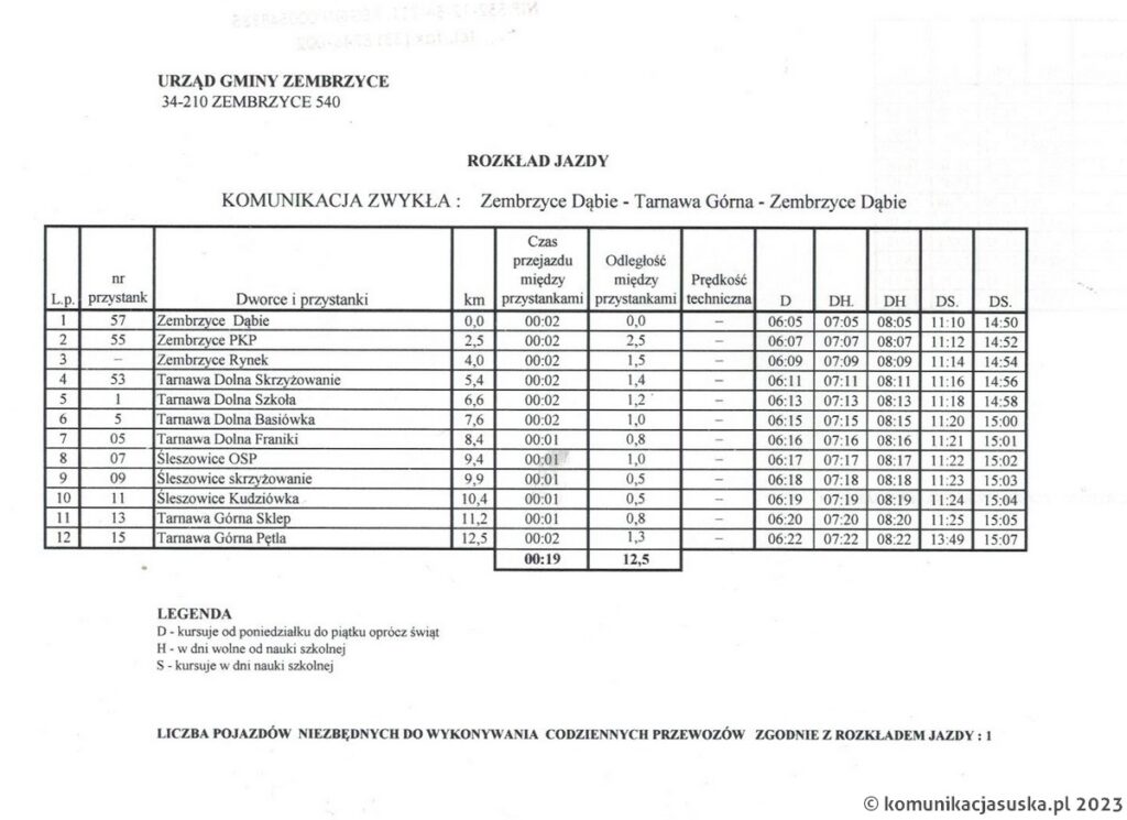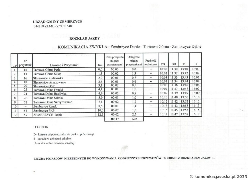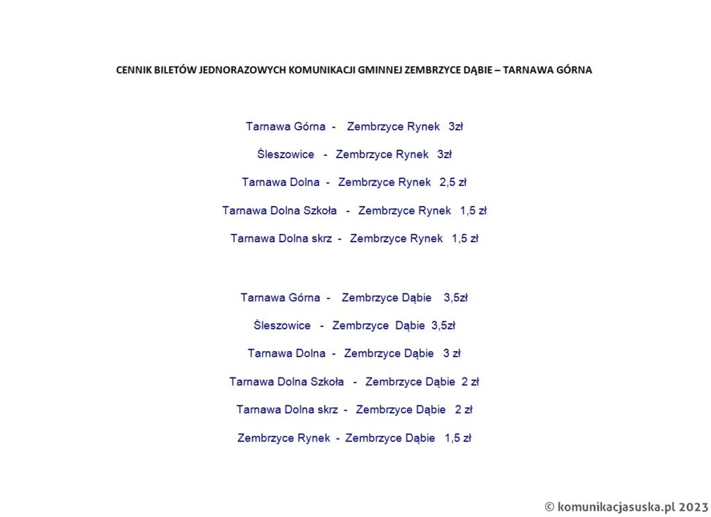 Poniżej prezentujemy szczegółowy rozkład jazdy oraz cennik biletów na linii Zembrzyce Dąbie – Tarnawa Górna.