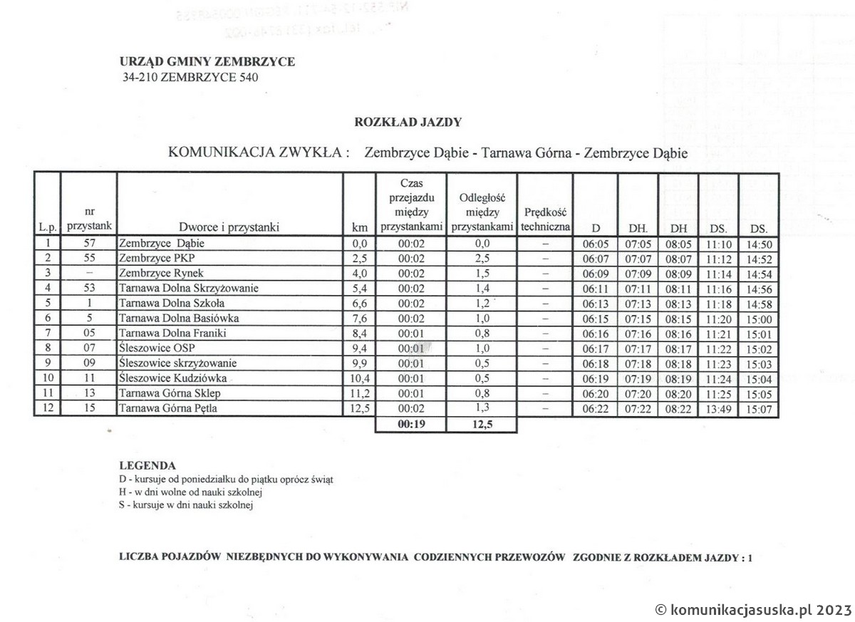 Odjazdy z przystanku Zembrzyce Dąbie: 6:05D, 7:05DH, 8:05DH, 11:10DS, 14:50DS
