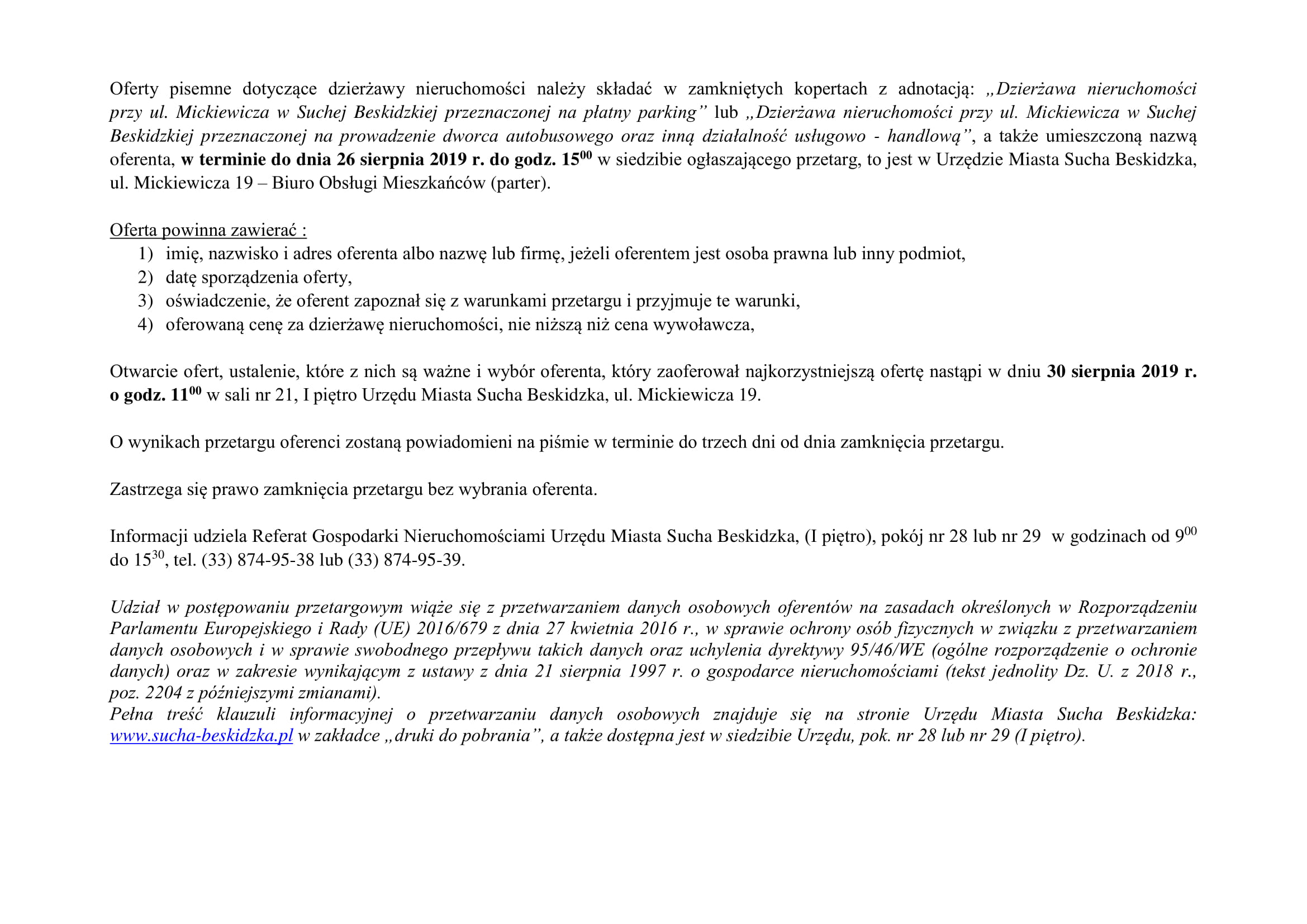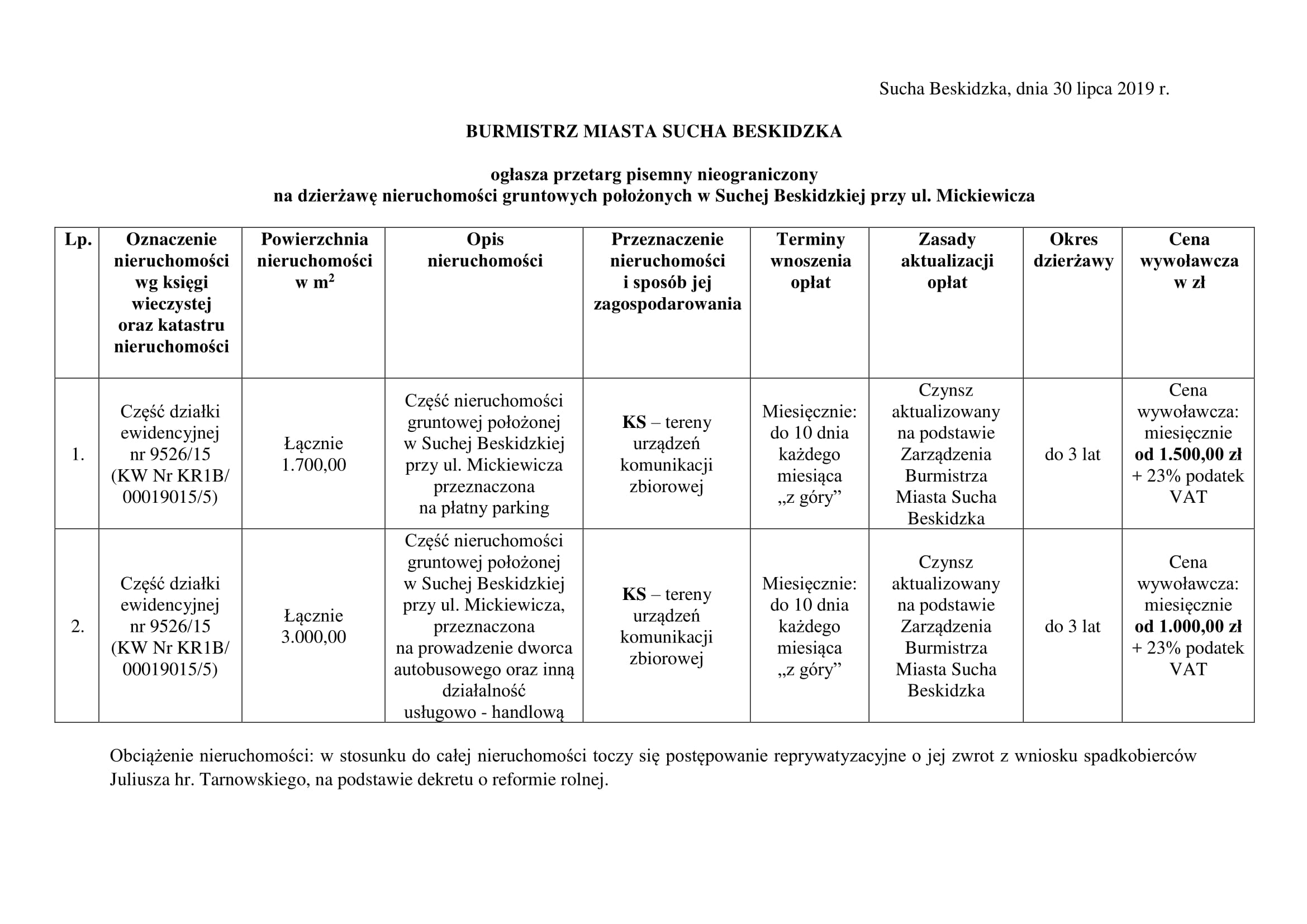 Oferty pisemne dotyczące dzierżawy nieruchomości należy składać w terminie do dnia 26 sierpnia 2019 r. do godz. 15:00 w Urzędzie Miasta Sucha Beskidzka. Urząd informuje, że w stosunku do całej nieruchomości toczy się postępowanie reprywatyzacyjne o jej zwrot z wniosku spadkobierców Juliusza hr. Tarnowskiego, na podstawie dekretu o reformie rolnej. Przetarg może zakończyć się bez wybrania oferenta.
