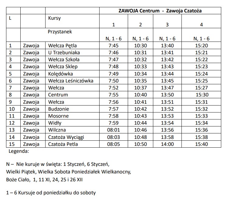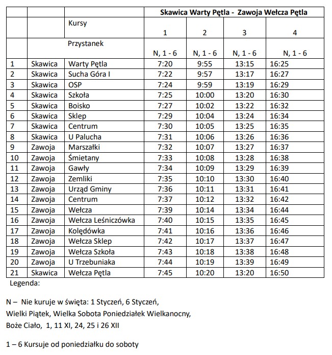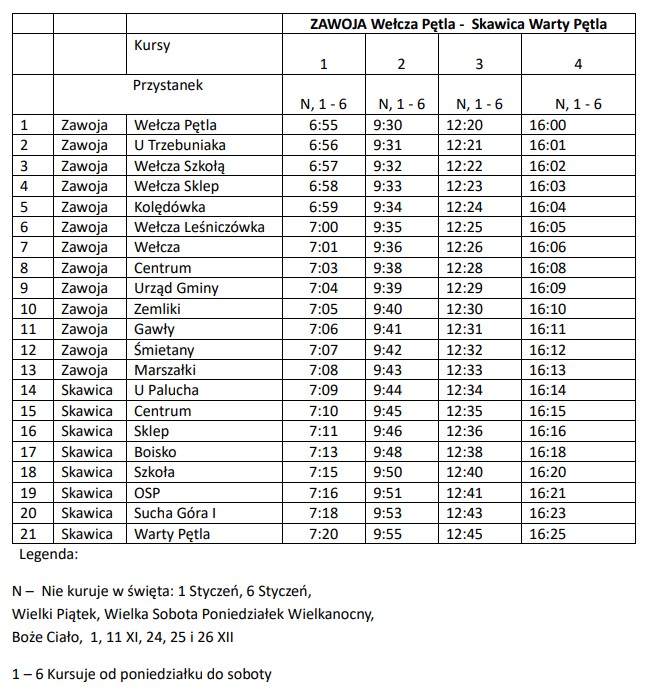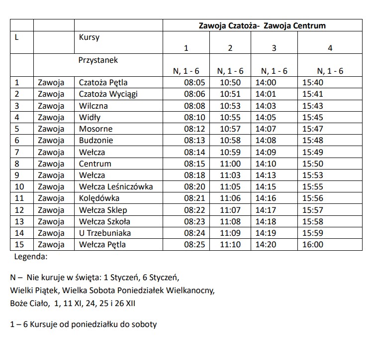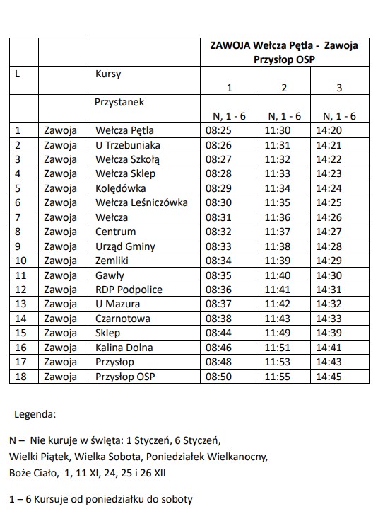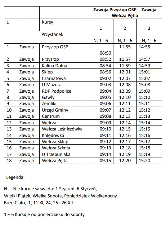 Na linii Zawoja Wełcza Pętla – Zawoja Przysłop OSP realizowane są 3 pary kursów dziennie, a na liniach Zawoja Czatoża – Zawoja Centrum (Wełcza) oraz Zawoja Wełcza Pętla – Skawica Warty Pętla po 4 pary kursów na dobę. Na tych liniach kursy odbywają się od poniedziałku do soboty za wyjątkiem następujących dni: 1 styczeń, 6 styczeń, Wielki Piątek, Wielka Sobota, Poniedziałek Wielkanocny, Boże Ciało, 1 listopad, 11 listopad oraz 24-26 grudnia.