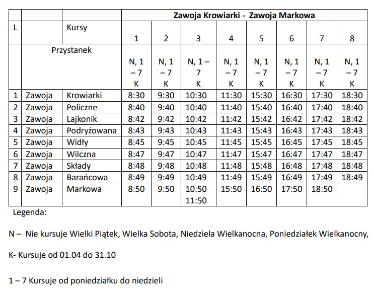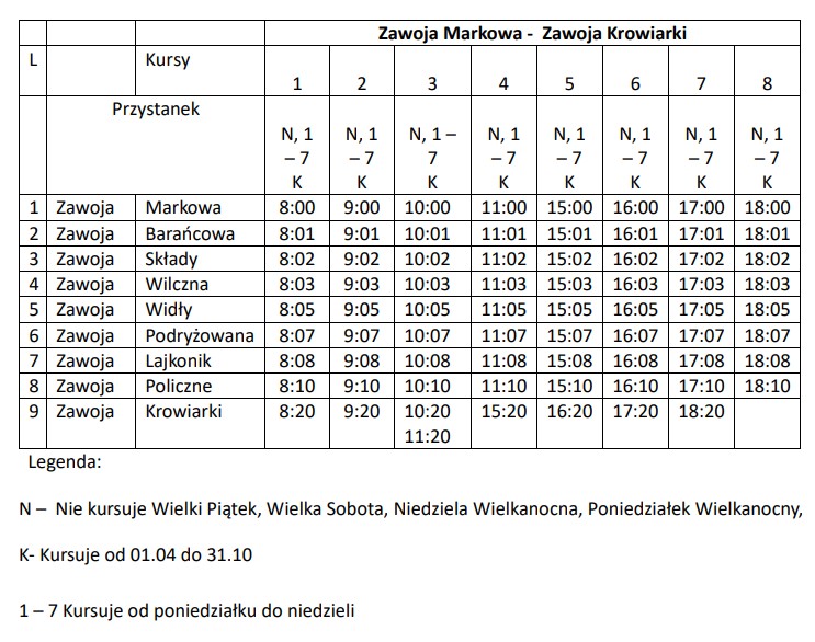 Linia sezonowa z Zawoi Markowej do Zawoi Krowiarki będzie obsługiwana codziennie w okresie od 1 kwietnia do 30 października z wyjątkiem Wielkiego Piątku, Wielkiej Soboty, Niedzieli Wielkanocnej i Poniedziałku Wielkanocnego. Tutaj codziennie (od poniedziałku do niedzieli) będzie realizowanych 8 kursów w każdym kierunku.