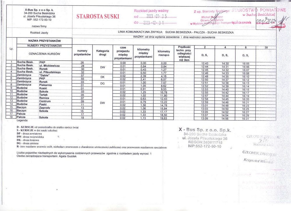 W ramach nowej linii realizowane są trzy pary kursów w dni nauki szkolnej. Bus z Palczy odjeżdża o godz. 6:25, 13:20 i 15:15, a w drogę powrotną z Suchej Beskidzkiej o 12:43, 14:30 i 16:05. Nowe kursy są odpowiedzią na potrzeby pasażerów, głównie uczniów szkół średnich, którzy dojeżdżają do Suchej Beskidzkiej, a po lekcjach wracają do swoich domów.
