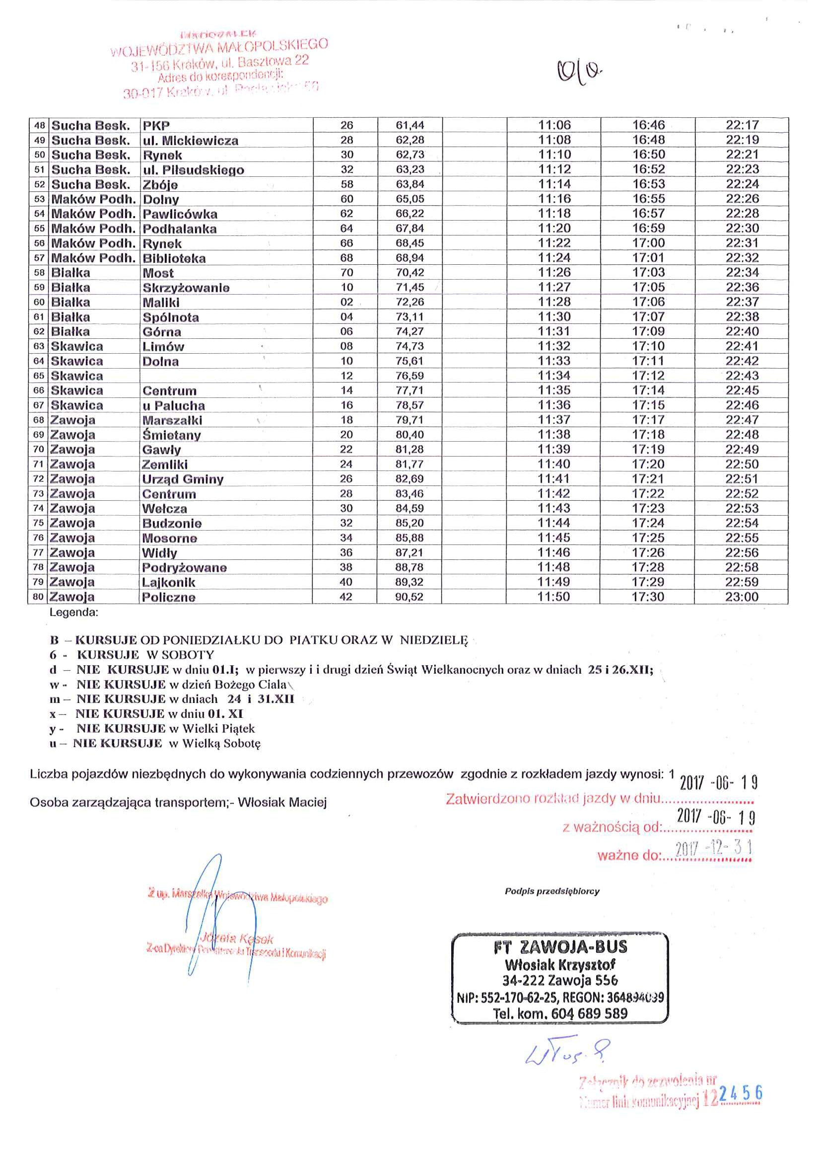 Wszystkie kursy realizowane będą od poniedziałku do niedzieli z wyjątkiem następujących dni: Nowego Roku, Wielkiej Soboty, pierwszego i drugiego dnia Świąt Wielkanocnych, Bożego Ciała, Wszystkich Świętych oraz 25 i 26 grudnia. Dodatkowo kursy wyjeżdżające z Zawoi o godz. 12:10 i 18:30 (odpowiednio 15:20 i 20:50 z Krakowa) nie będą kursować także w Wielki Piątek, Wigilię oraz Sylwestra.